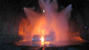 The combination of an optimal droplet size and a dispersion of the droplets under high pressure, ensures a deep penetration of the water mist into the fire source and a rapid cooling of the flue gases. In addition, flue gases are cleaned from the air and this allows the fire brigade to enter the extinguishing area more quickly.